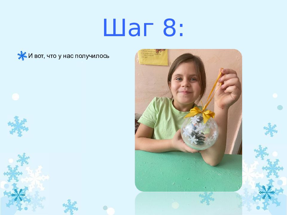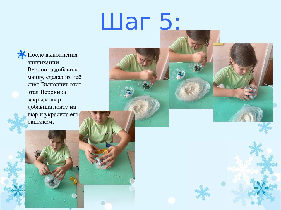 После выполнения аппликации Вероника добавила манку, сделав из неё снег. Выполнив этот этап Вероника закрыла шар добавила ленту на шар и украсила его бантиком.