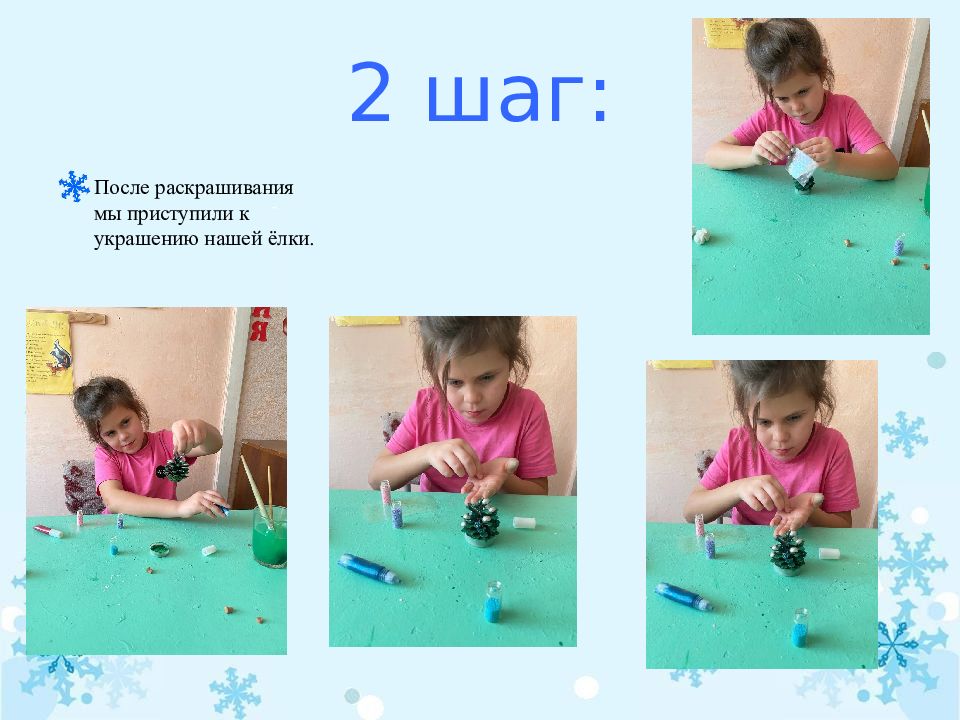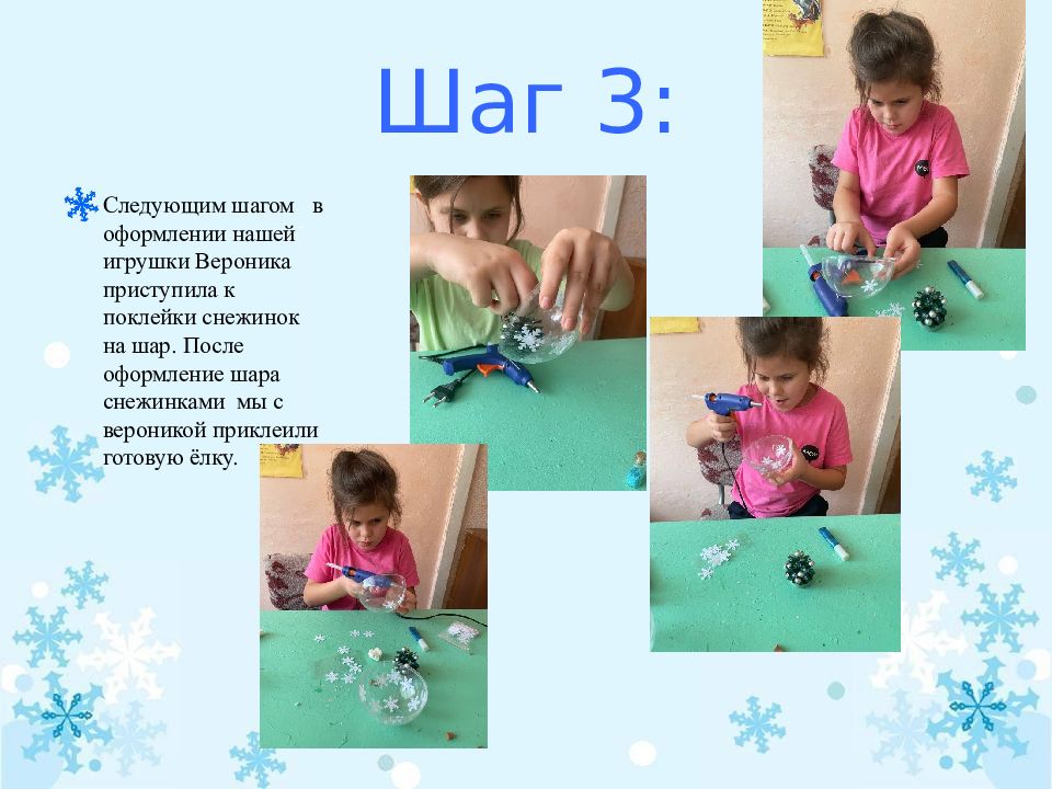 Следующим шагом в оформлении нашей игрушки Вероника приступила к поклейки снежинок на шар. После оформление шара снежинками мы с вероникой приклеили готовую ёлку.