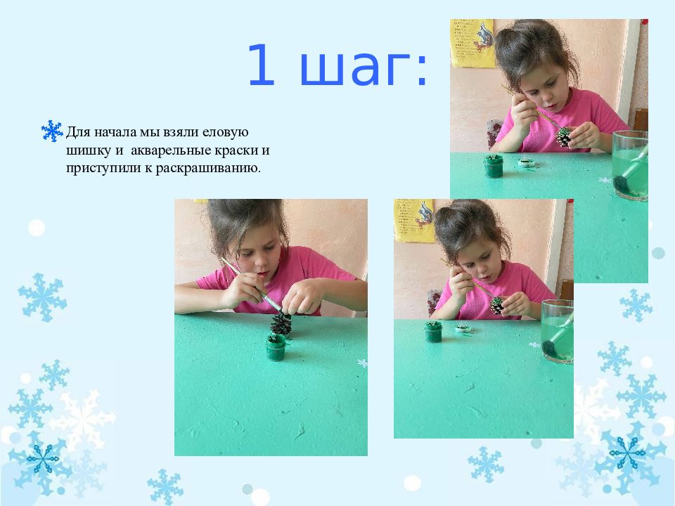 Для начала мы взяли еловую шишку и акварельные краски и приступили к раскрашиванию.