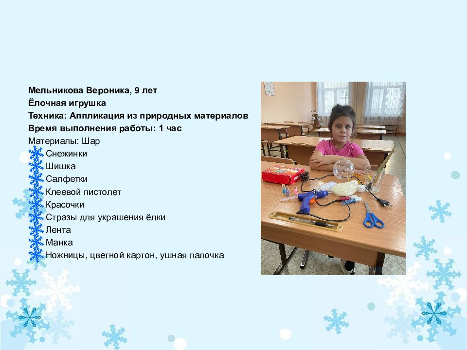 Мельникова Вероника, 9 лет Ёлочная игрушка Техника: Аппликация из природных материалов Время выполнения работы: 1 час Материалы: Шар Снежинки Шишка Салфетки Клеевой пистолет Красочки Стразы для украшения ёлки Лента Манка Ножницы, цветной картон, ушная палочка