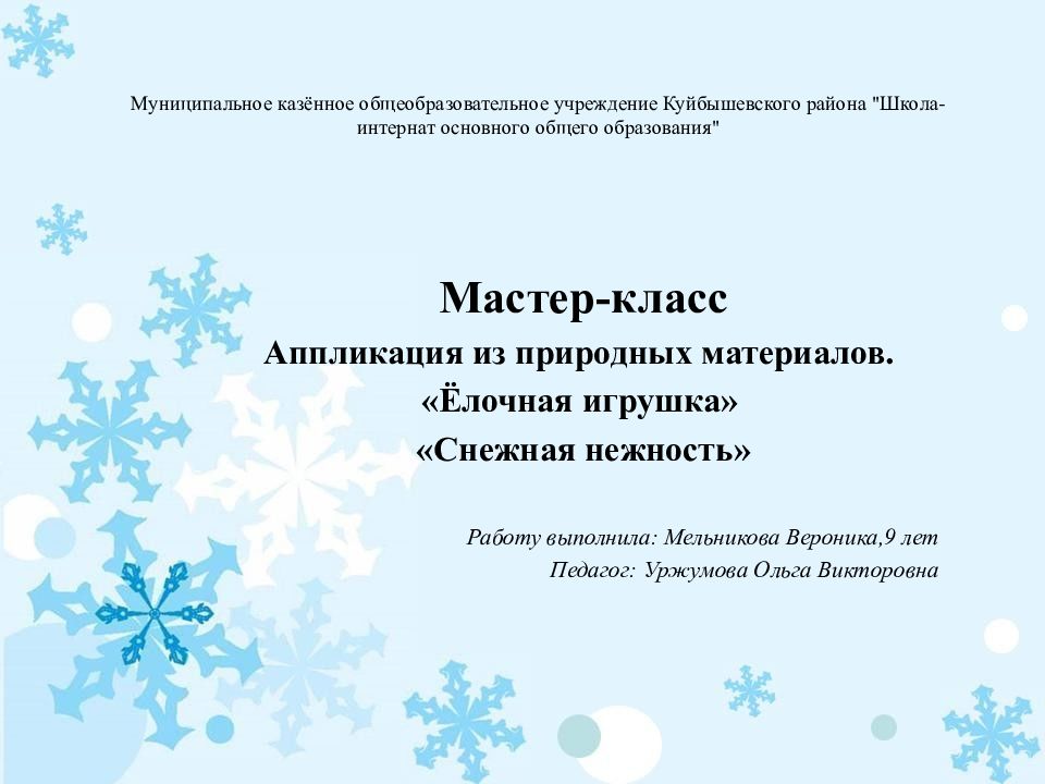 Мастер-класс Аппликация из природных материалов. «Ёлочная игрушка» «Снежная нежность» Работу выполнила: Мельникова Вероника,9 лет Педагог: Уржумова Ольга Викторовна
