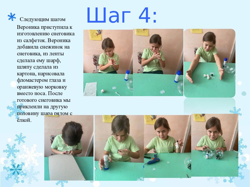 Следующим шагом Вероника приступила к изготовлению снеговика из салфеток. Вероника добавила снежинок на снеговика, из ленты сделала ему шарф, шляпу сделала из картона, нарисовала фломастером глаза и оранжевую морковку вместо носа. После готового снеговика мы приклеили на другую половину шара рядом с ёлкой.