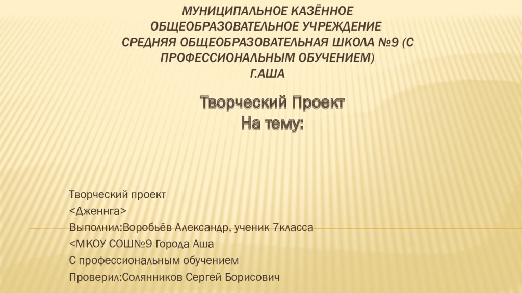Творческий проект < Дженнга > Выполнил:Воробьёв Александр, ученик 7класса <МКОУ СОШ№9 Города Аша С профессиональным обучением Проверил:Солянников Сергей Борисович Творческий Проект На тему:
