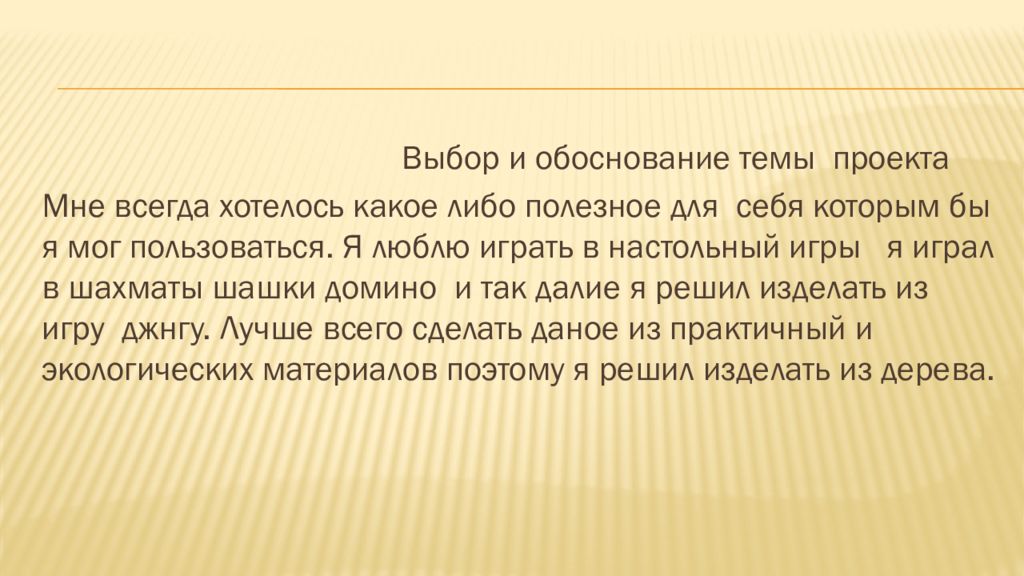 Выбор и обоснование темы проекта Мне всегда хотелось какое либо полезное для себя которым бы я мог пользоваться. Я люблю играть в настольный игры я играл в шахматы шашки домино и так далие я решил изделать из игру джнгу. Лучше всего сделать даное из практичный и экологических материалов поэтому я решил изделать из дерева.