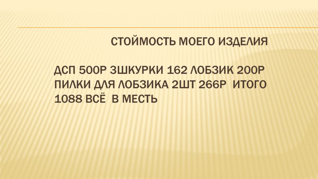 Слайд 7: стоймость моего изделия дсп 500Р 3шкурки 162 лобзик 200р пилки для лобзика 2шт 266р итого 1088 всё в месть