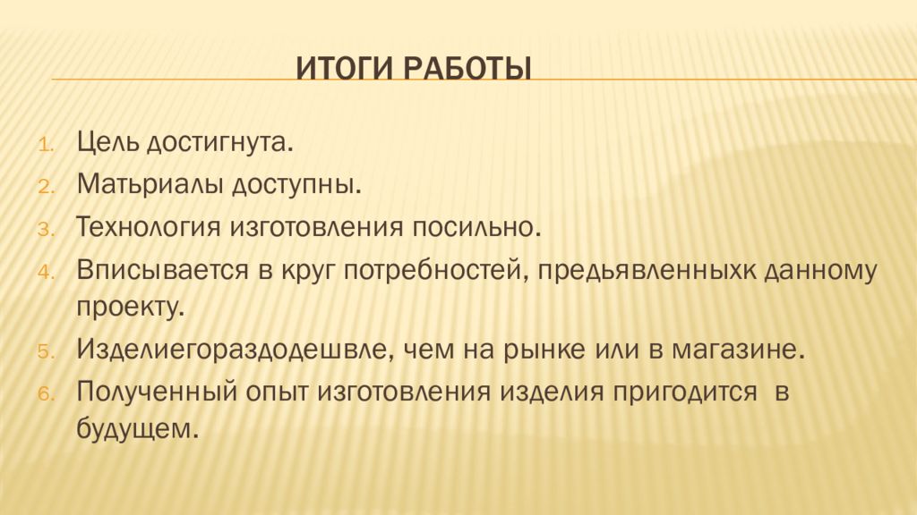 Цель достигнута. Матьриалы доступны. Технология изготовления посильно. Вписывается в круг потребностей, предьявленныхк данному проекту. Изделиегораздодешвле, чем на рынке или в магазине. Полученный опыт изготовления изделия пригодится в будущем.