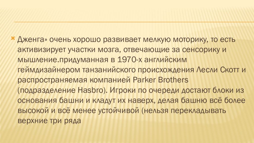 Дженга» очень хорошо развивает мелкую моторику, то есть активизирует участки мозга, отвечающие за сенсорику и мышление.придуманная в 1970-х английским геймдизайнером танзанийского происхождения Лесли Скотт и распространяемая компанией Parker Brothers ( подразделение Hasbro). Игроки по очереди достают блоки из основания башни и кладут их наверх, делая башню всё более высокой и всё менее устойчивой (нельзя перекладывать верхние три ряда