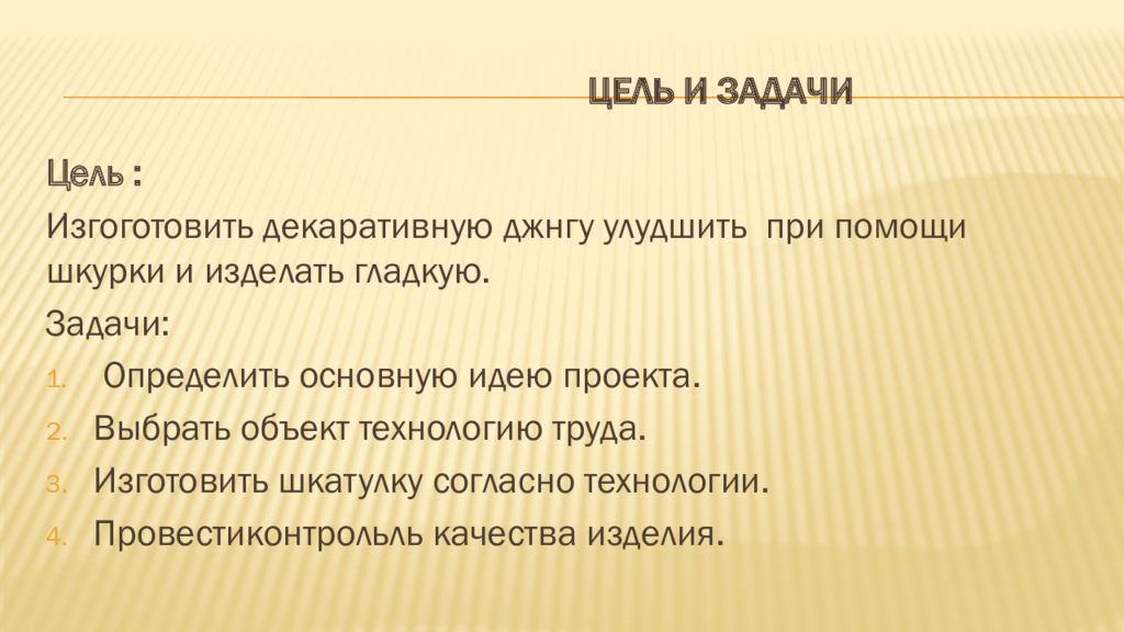 Цель : Изгоготовить декаративную джнгу улудшить при помощи шкурки и изделать гладкую. Задачи: Определить основную идею проекта. Выбрать объект технологию труда. Изготовить шкатулку согласно технологии. Провестиконтрольль качества изделия.