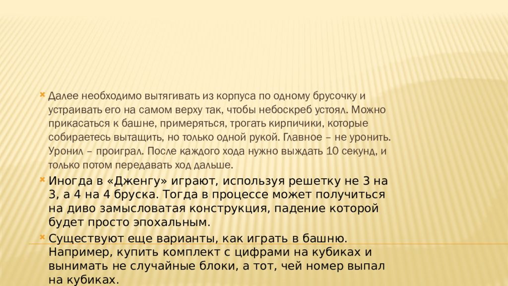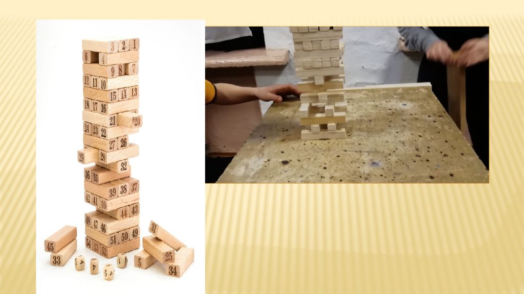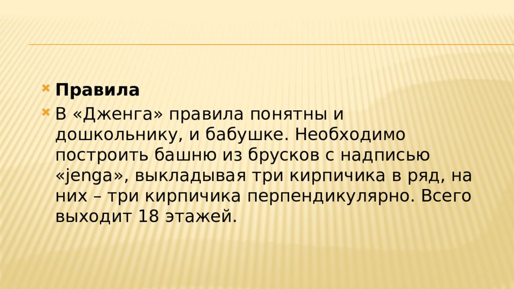 Правила В «Дженга» правила понятны и дошкольнику, и бабушке. Необходимо построить башню из брусков с надписью « jenga», выкладывая три кирпичика в ряд, на них – три кирпичика перпендикулярно. Всего выходит 18 этажей.
