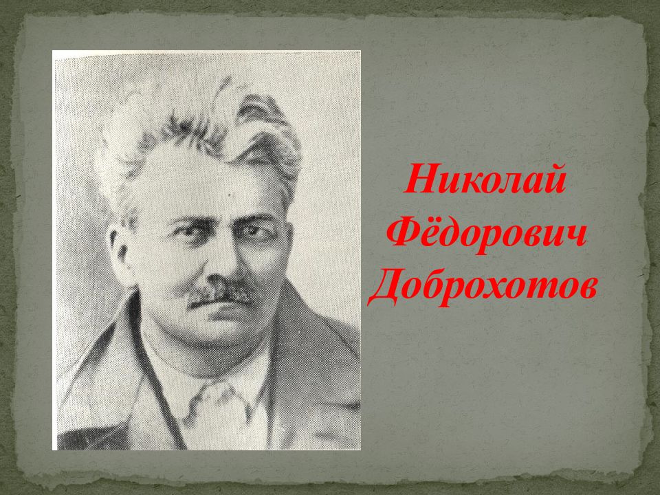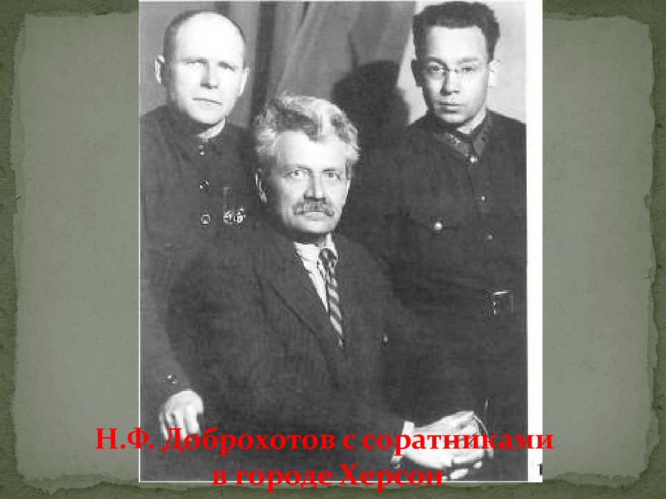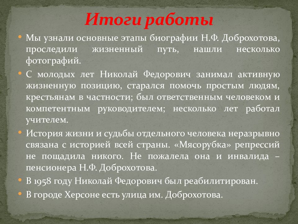 М ы узнали основные этапы биографии Н.Ф. Доброхотова, проследили жизненный путь, нашли несколько фотографий. С молодых лет Николай Федорович занимал активную жизненную позицию, старался помочь простым людям, крестьянам в частности; был ответственным человеком и компетентным руководителем; несколько лет работал учителем. История жизни и судьбы отдельного человека неразрывно связана с историей всей страны. « Мясорубка» репрессий не пощадила никого. Не пожалела она и инвалида – пенсионера Н.Ф. Доброхотова. В 1958 году Николай Федорович был реабилитирован. В городе Херсоне есть улица им. Доброхотова. Итоги работы