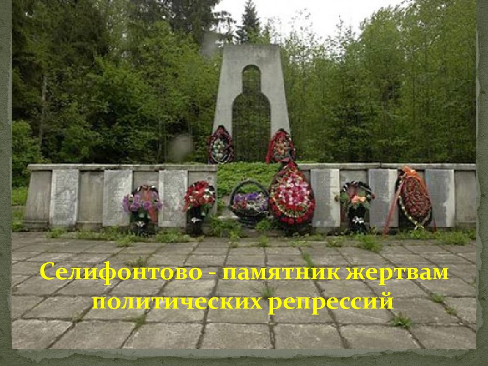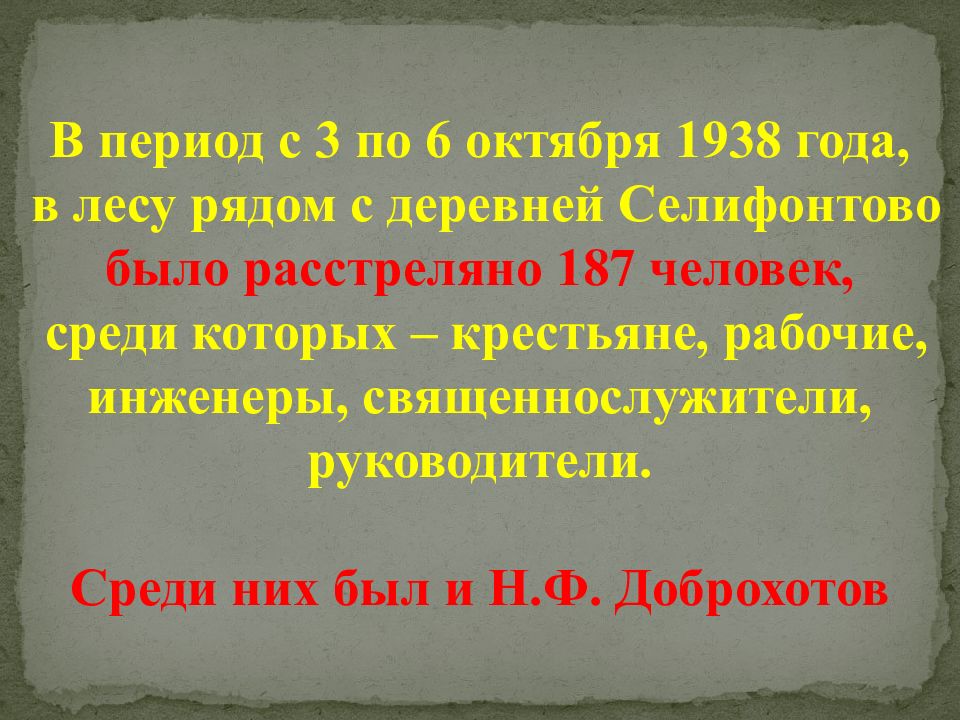 В период с 3 по 6 октября 1938 года, в лесу рядом с деревней Селифонтово было расстреляно 187 человек, среди которых – крестьяне, рабочие, инженеры, священнослужители, руководители. Среди них был и Н.Ф. Доброхотов