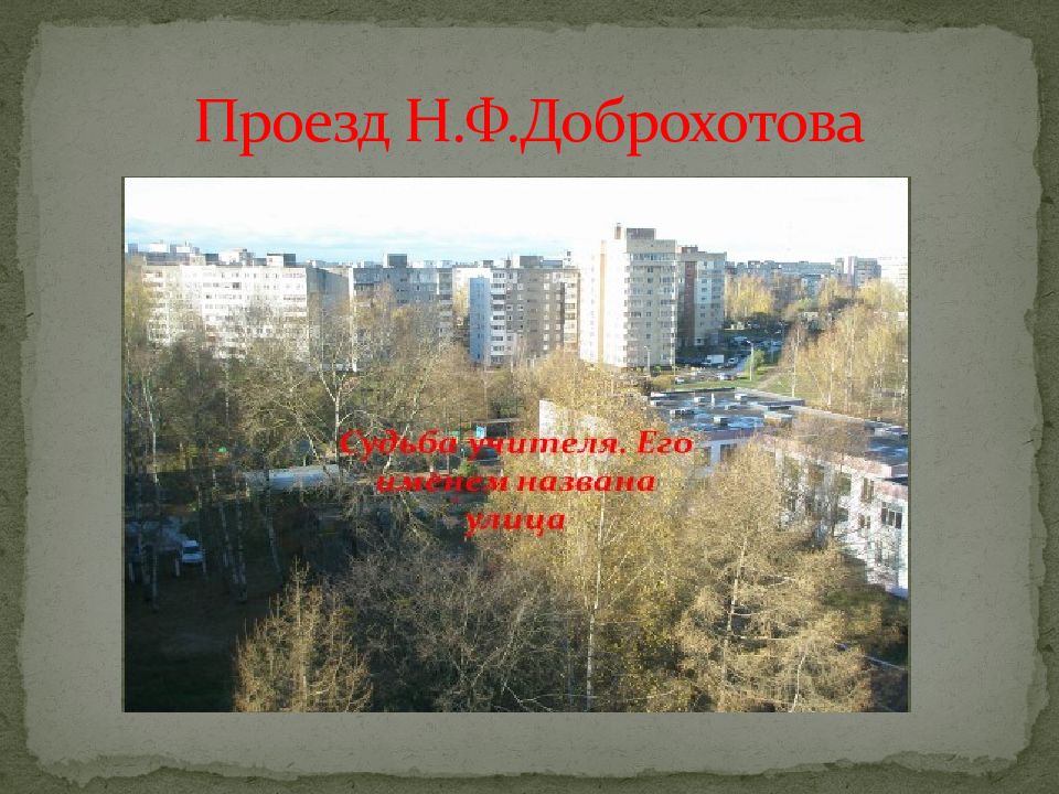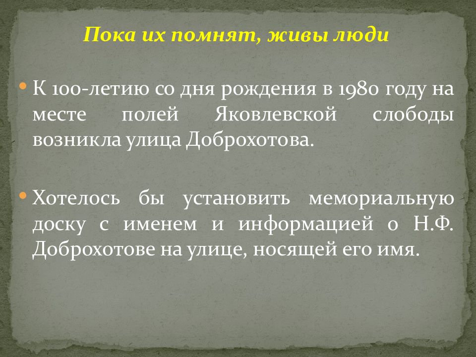 Пока их помнят, живы люди К 100-летию со дня рождения в 1980 году на месте полей Яковлевской слободы возникла улица Доброхотова. Хотелось бы установить мемориальную доску с именем и информацией о Н.Ф. Доброхотове на улице, носящей его имя.