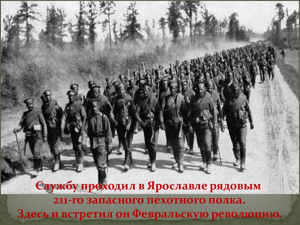Службу проходил в Ярославле рядовым 211-го запасного пехотного полка. Здесь и встретил он Февральскую революцию.