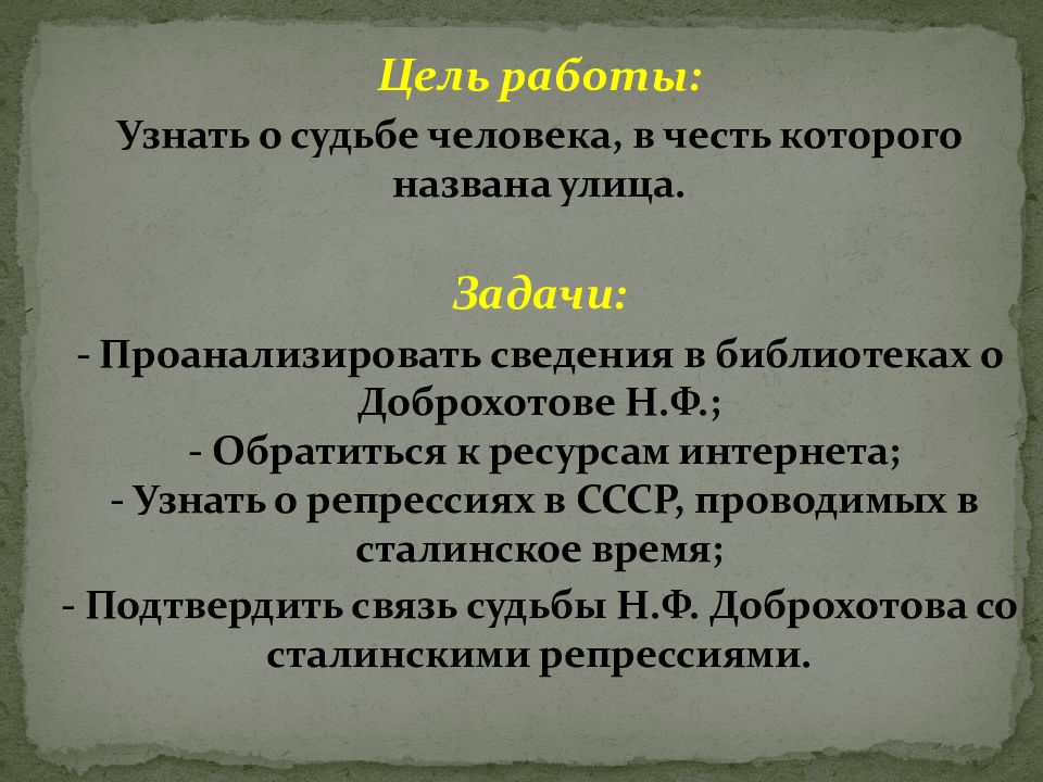 Цель работы : Узнать о судьбе человека, в честь которого названа улица. Задачи: - Проанализировать сведения в библиотеках о Доброхотове Н.Ф.; - Обратиться к ресурсам интернета; - Узнать о репрессиях в СССР, проводимых в сталинское время; - Подтвердить связь судьбы Н.Ф. Доброхотова со сталинскими репрессиями.