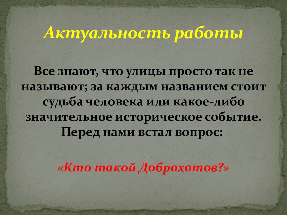 Все знают, что улицы просто так не называют; за каждым названием стоит судьба человека или какое-либо значительное историческое событие. Перед нами встал вопрос: « Кто такой Доброхотов?» Актуальность работы