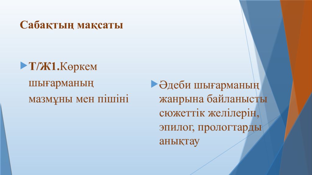 Т/Ж1. Көркем шығарманың мазмұны мен пішіні Әдеби шығарманың жанрына байланысты сюжеттік желілерін, эпилог, прологтарды анықтау