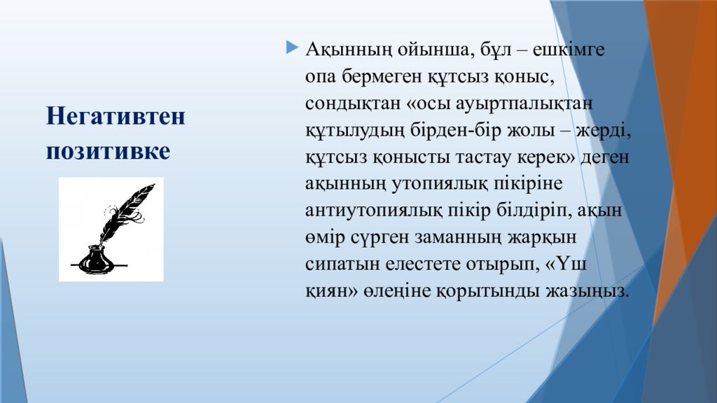 Ақынның ойынша, бұл – ешкімге опа бермеген құтсыз қоныс, сондықтан «осы ауыртпалықтан құтылудың бірден-бір жолы – жерді, құтсыз қонысты тастау керек» деген ақынның утопиялық пікіріне антиутопиялық пікір білдіріп, ақын өмір сүрген заманның жарқын сипатын елестете отырып, «Үш қиян» өлеңіне қорытынды жазыңыз.