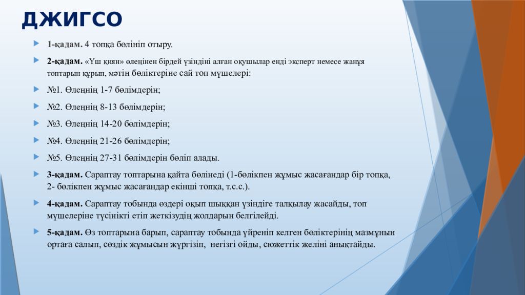 1-қадам. 4 топқа бөлініп отыру. 2-қадам. «Үш қиян» өлеңінен бірдей үзіндіні алған оқушылар енді эксперт немесе жанұя топтарын құрып, м әтін бөліктеріне сай топ мүшелері: №1. Өлеңнің 1-7 бөлімдерін; №2. Өлеңнің 8-13 бөлімдерін; №3. Өлеңнің 14-20 бөлімдерін; №4. Өлеңнің 21-26 бөлімдерін; №5. Өлеңнің 27-31 бөлімдерін бөліп алады. 3-қадам. Сараптау топтарына қайта бөлінеді (1-бөлікпен жұмыс жасағандар бір топқа, 2- бөлікпен жұмыс жасағандар екінші топқа, т.с.с.). 4-қадам. Сараптау тобында өздері оқып шыққан үзіндіге талқылау жасайды, топ мүшелеріне түсінікті етіп жеткізудің жолдарын белгілейді. 5-қадам. Өз топтарына барып, сараптау тобында үйреніп келген бөліктерінің мазмұнын ортаға салып, сөздік жұмысын жүргізіп, негізгі ойды, сюжеттік желіні анықтайды.