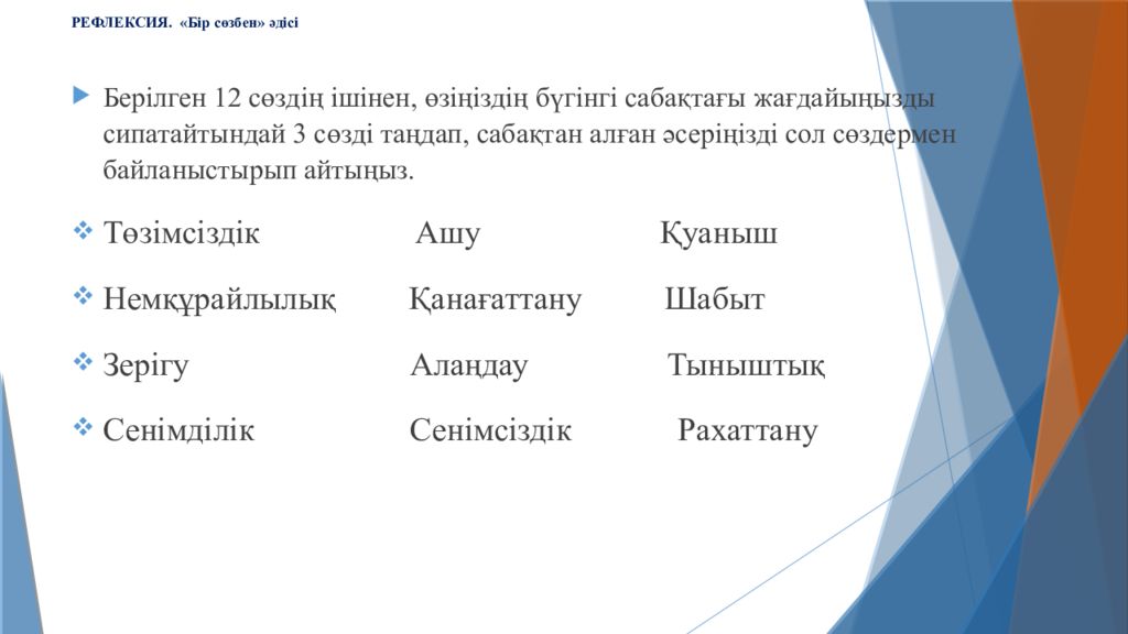 Слайд 11: Рефлексия. «Бір сөзбен» әдісі