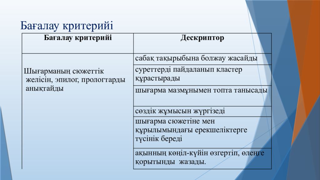 Бағалау критерийі Дескриптор Шығарманың сюжеттік желісін, эпилог, прологтарды анықтайды сабақ тақырыбына болжау жасайды суреттерді пайдаланып кластер құрастырады шығарма мазмұнымен топта танысады сөздік жұмысын жүргізеді шығарма сюжетіне мен құрылымындағы ерекшеліктер ге түсінік береді ақынның көңіл-күйін өзгертіп, өлеңге қорытынды жазады.