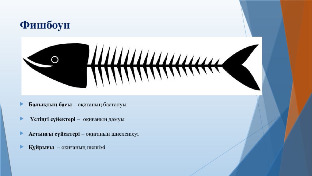 Балықтың басы – оқиғаның басталуы Үстіңгі сүйектері – оқиғаның дамуы Астыңғы сүйектері – оқиғаның шиеленісуі Құйрығы – оқиғаның шешімі