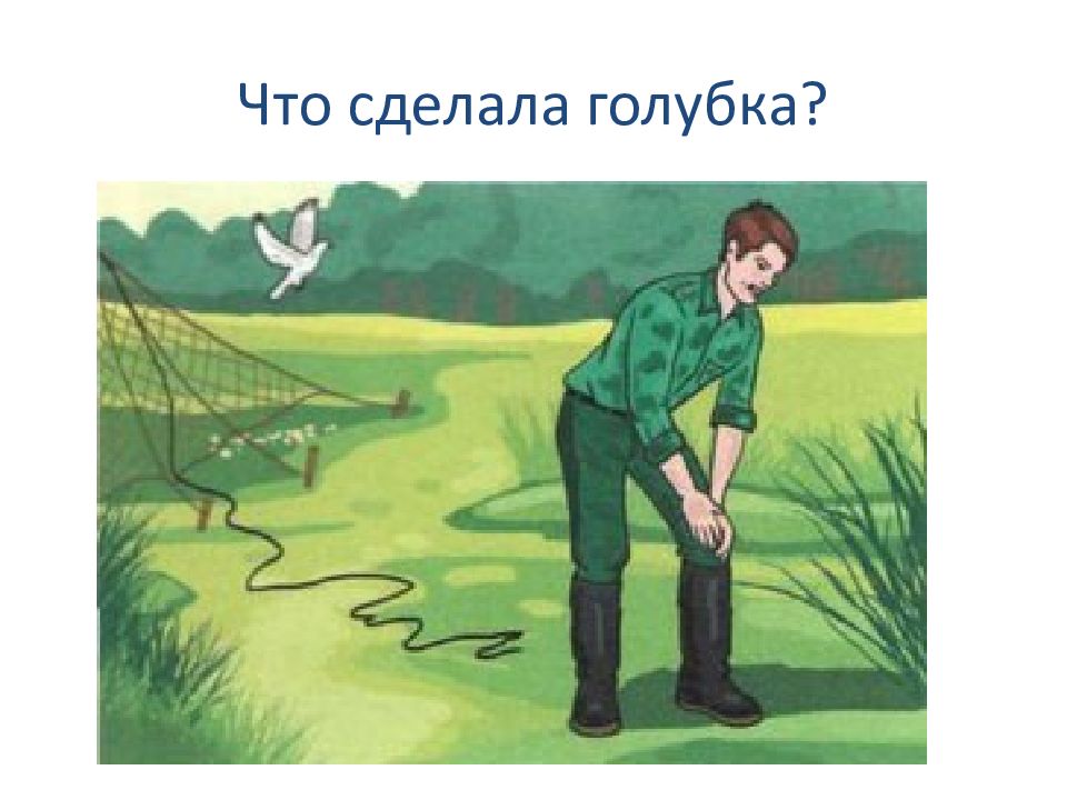 Куда спустился муравей? к ручью Что сделала волна ? накрыла его Что бросила ему голубка ? ветку Как муравей спасся ? сел на ветку, выбрался Чем однажды охотник поймал голубку ? сетью Как муравей помог голубке? подполз, укусил Что сделал охотник ? бросил сеть Что сделала голубка ? вспорхнула, улетела