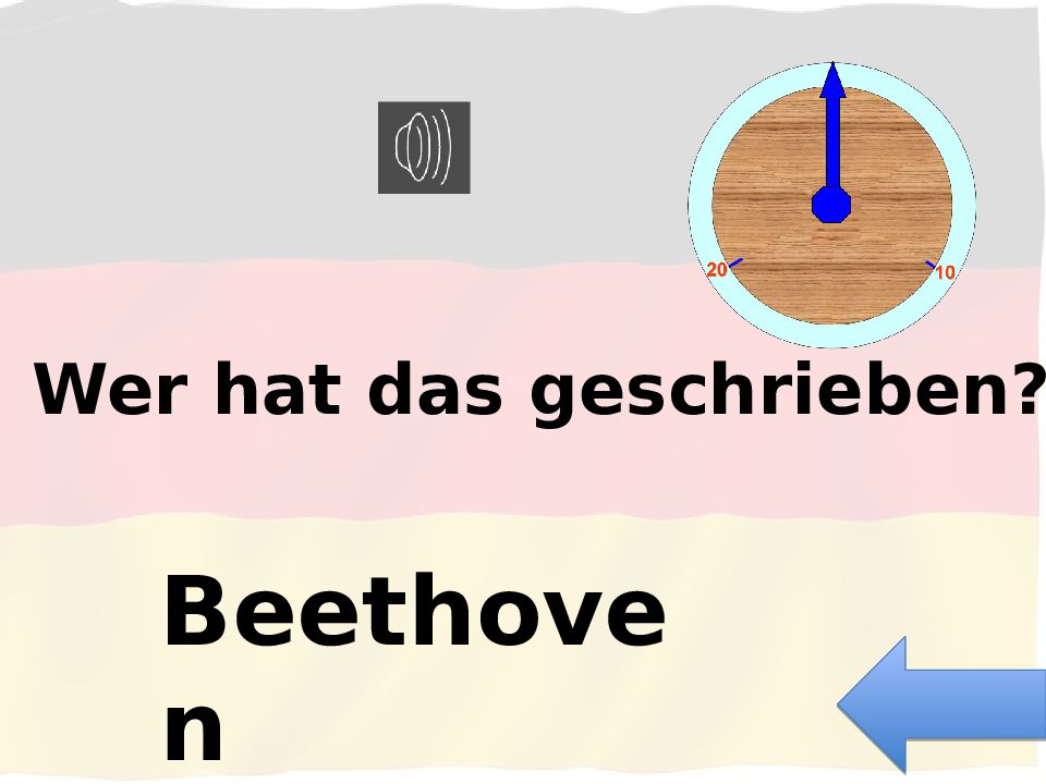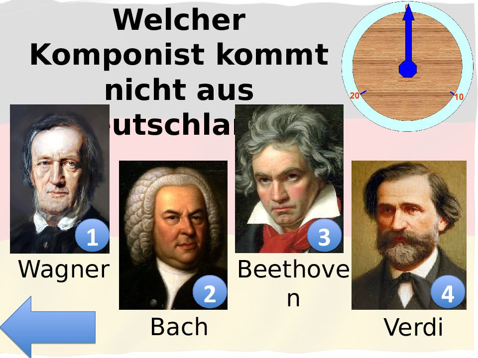 Welche r Komponist kommt nicht aus Deutschland ? Wagner 1 2 3 Bach Beethoven Verdi 4