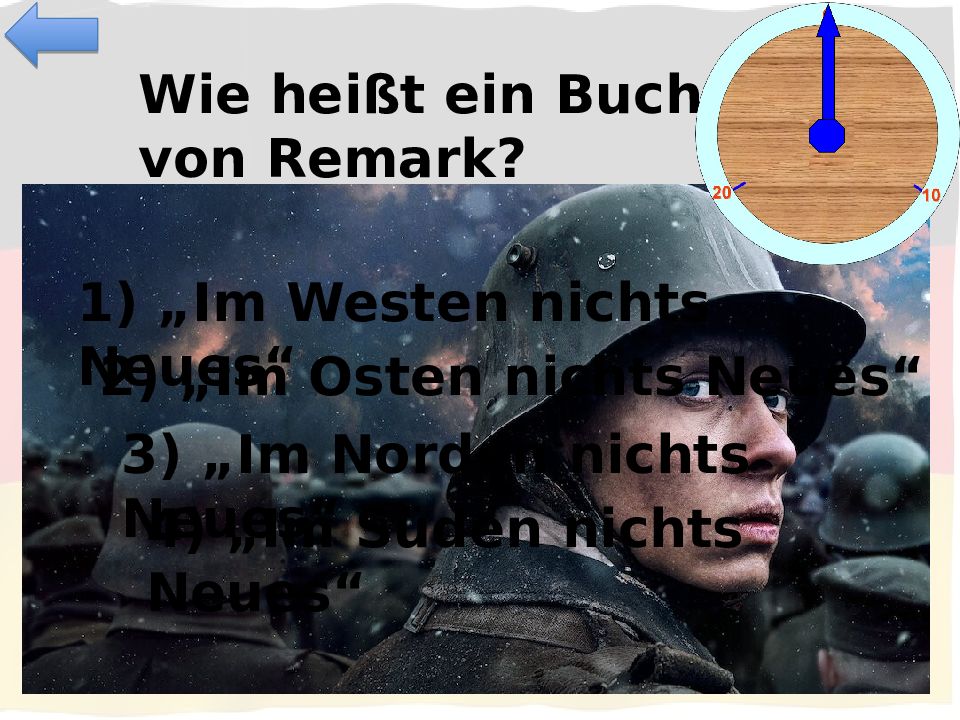 Wie heißt ein Buch von Remark? 1) „Im Westen nichts Neues“ 2) „Im Osten nichts Neues“ 3) „Im Norden nichts Neues“ 4) „Im Süden nichts Neues“