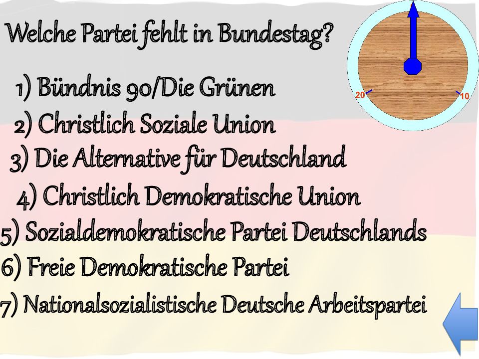 Welche Partei fehlt in Bundestag? 4 ) Christlich Demokratische Union 2) Christlich Soziale Union 3) Die Alternative für Deutschland 1) Bündnis 90/Die Grünen 6) Freie Demokratische Partei 7) Nationalsozialistische Deutsche Arbeitspartei 5) Sozialdemokratische Partei Deutschlands