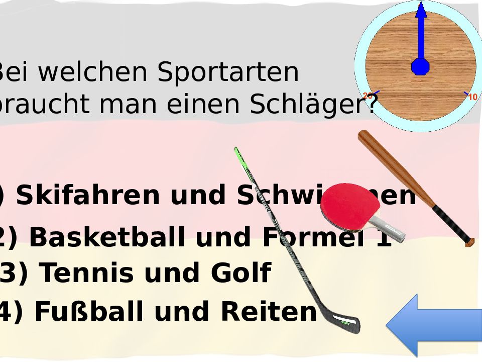 1) Skifahren und Schwimmen 2) Basketball und Formel 1 3) Tennis und Golf Bei welchen Sportarten braucht man einen Schläger? 4) Fußball und Reiten
