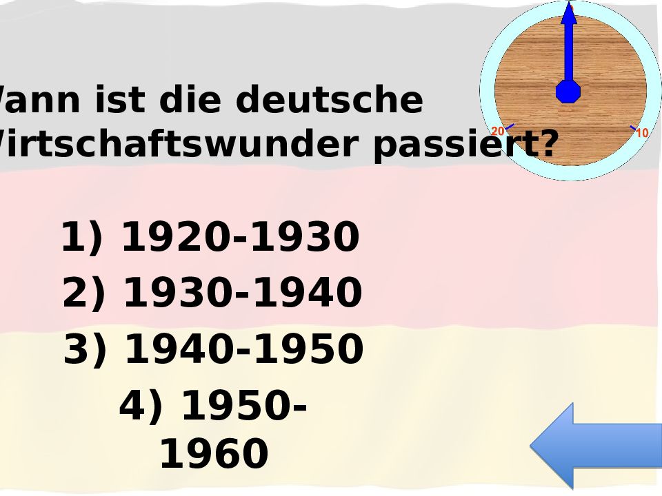 2) 1930-1940 1) 1920-1930 3) 1940-1950 Wann ist die deutsche Wirtschaftswunder passiert? 4) 1950-1960