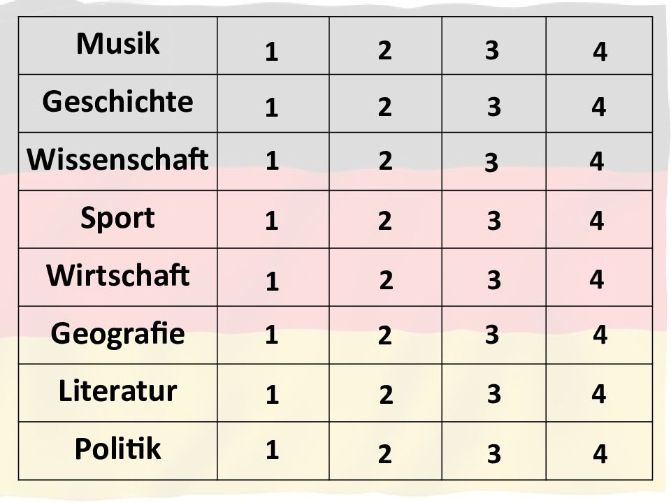 Musik Geschichte Wissenschaft Sport Wirtschaft Geografie Literatur Politik 1 1 1 1 1 1 2 2 2 2 2 2 3 3 3 3 3 3 4 4 4 4 4 4 1 1 2 2 3 3 4 4