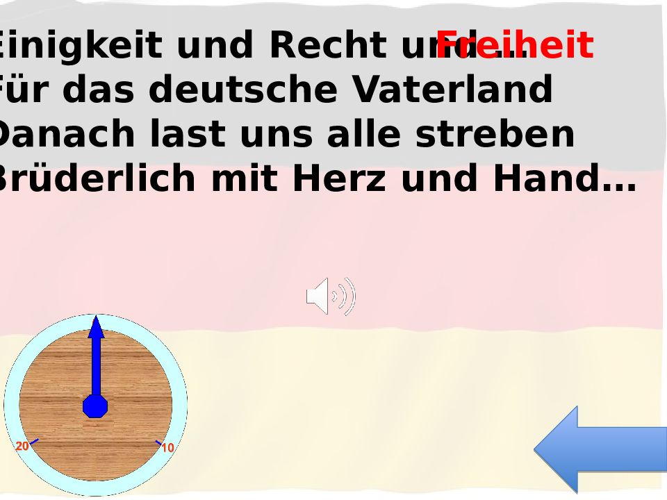 Einigkeit und Recht und … Für das deutsche Vaterland Danach last uns alle streben Brüderlich mit Herz und Hand… Freiheit