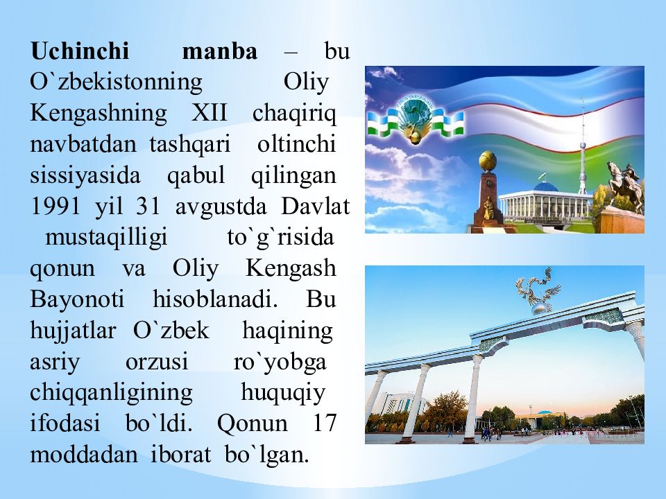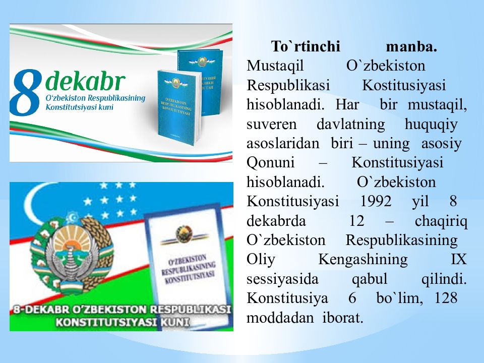 T o` rtinchi manba. Mustaqil O` zbekiston Respublikasi Kostitusiyasi h isoblanadi. H ar bir musta q il, suveren davlatning h u q u q iy asoslaridan biri – uning asosiy Q onuni – Konstitusiyasi h isoblanadi. O` zbekiston Konstitusiyasi 1992 yil 8 dekabrda 12 – cha q iri q O` zbekiston Respublikasining Oliy Kengashining IX sessiyasida q abul q ilindi. Konstitusiya 6 b o` lim, 128 moddadan iborat.