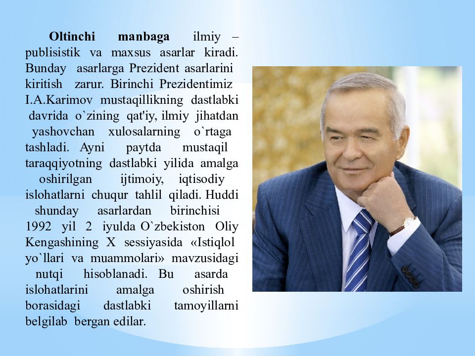 Oltinchi manbaga ilmiy – publisistik va maxsus asarlar kiradi. Bunday asarlarga Prezident asarlarini kiritish zarur. Birinchi Prezidentimiz I.A.Karimov musta q illikning dastlabki davrida o` zining q at'iy, ilmiy ji h atdan yashovchan xulosalarning o` rtaga tashladi. Ayni paytda musta q il tara qq iyotning dastlabki yilida amalga oshirilgan ijtimoiy, i q tisodiy islo h atlarni chu q ur ta h lil q iladi. H uddi shunday asarlardan birinchisi 1992 yil 2 iyulda O` zbekiston Oliy Kengashining X sessiyasida « Isti q lol y o` llari va muammolari » mavzusidagi nut q i h isoblanadi. Bu asarda islo h atlarini amalga oshirish borasidagi dastlabki tamoyillarni belgilab bergan edilar.