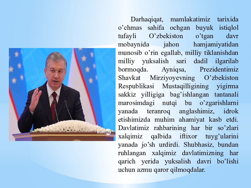 Darhaqiqat, mamlakatimiz tarixida o’chmas sahifa ochgan buyuk istiqlol tufayli O’zbekiston o’tgan davr mobaynida jahon hamjamiyatidan munosib o’rin egallab, milliy tiklanishdan milliy yuksalish sari dadil ilgarilab bormoqda. Ayniqsa, Prezidentimiz Shavkat Mirziyoyevning O’zbekiston Respublikasi Mustaqilligining yigirma sakkiz yilligiga bag’ishlangan tantanali marosimdagi nutqi bu o’zgarishlarni yanada teranroq anglashimiz, idrok etishimizda muhim ahamiyat kasb etdi. Davlatimiz rahbarining har bir so’zlari xalqimiz qalbida iftixor tuyg’ularini yanada jo’sh urdirdi. Shubhasiz, bundan ruhlangan xalqimiz davlatimizning har qarich yerida yuksalish davri bo’lishi uchun azmu qaror qilmoqdalar.