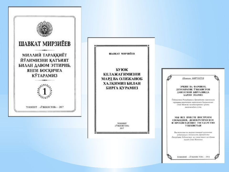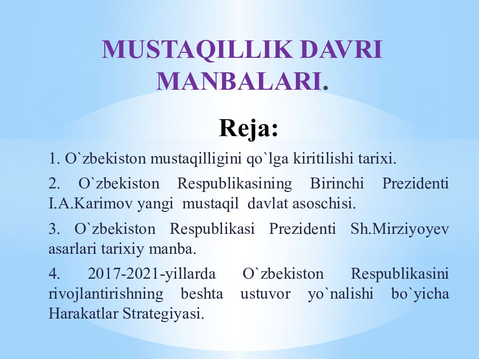 Reja : 1. O`zbekiston mustaqilligini qo`lga kir i tilishi tarixi. 2. O`zbekiston Respublikasining Birinchi Prezidenti I.A.Karimov yangi mustaqil davlat asoschisi. 3. O`zbekiston Respublikasi Prezidenti Sh.Mirziyoyev asarlari tarixiy manba. 4. 2017-2021-yillarda O`zbekiston Respublikasini rivojlantirishning beshta ustuvor yo`nalishi bo`yicha Harakatlar Strategiyasi. MUSTAQILLIK DAVRI MANBALARI.