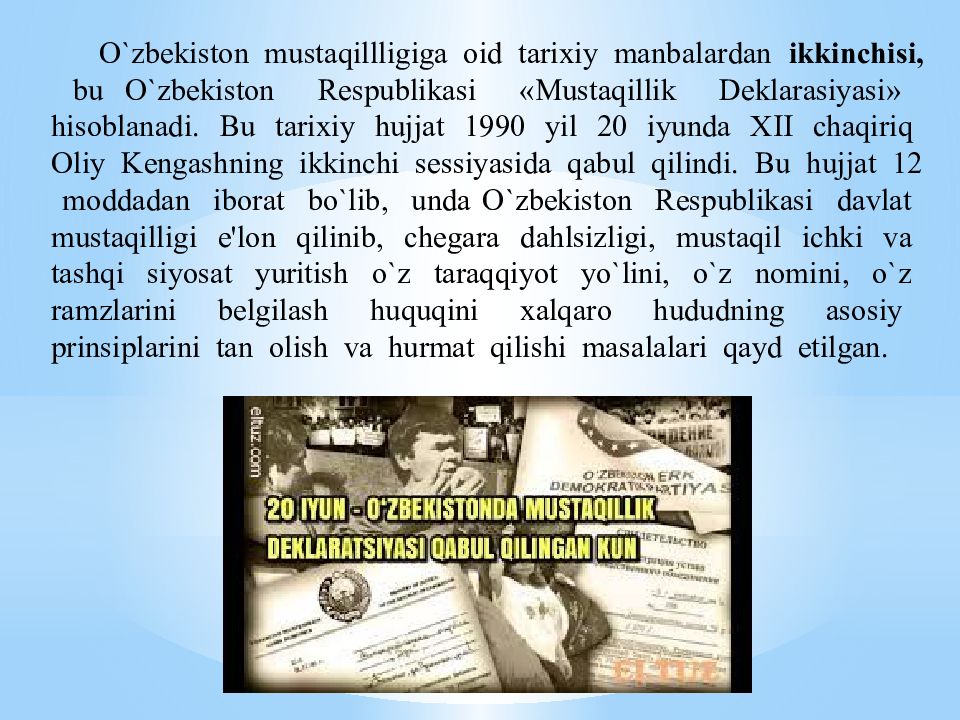 O` zbekiston musta q illligiga oid tarixiy manbalardan ikkinchisi, bu O` zbekiston Respublikasi « Musta q illik Deklarasiyasi » h isoblanadi. Bu tarixiy h ujjat 1990 yil 20 iyunda XII cha q iri q Oliy Kengashning ikkinchi sessiyasida q abul q ilindi. Bu h ujjat 12 moddadan iborat b o` lib, unda O` zbekiston Respublikasi davlat musta q illigi e'lon q ilinib, chegara dahlsizligi, musta q il ichki va tash q i siyosat yuritish o` z tara qq iyot y o` lini, o` z nomini, o` z ramzlarini belgilash h u q u q ini xal q aro h ududning asosiy prinsiplarini tan olish va h urmat q ilishi masalalari q ayd etilgan.
