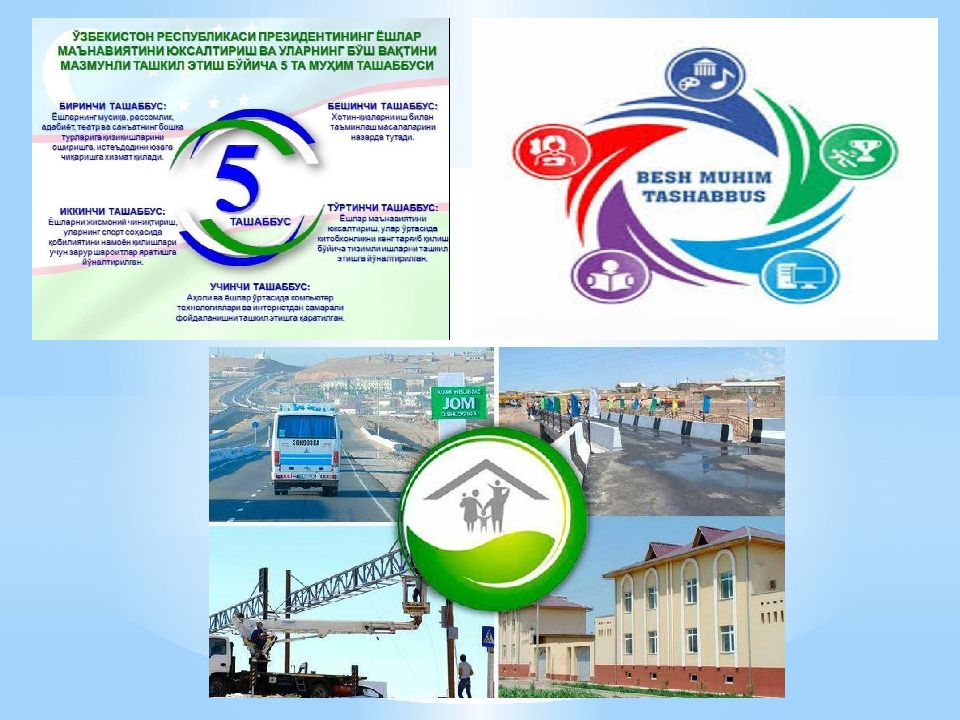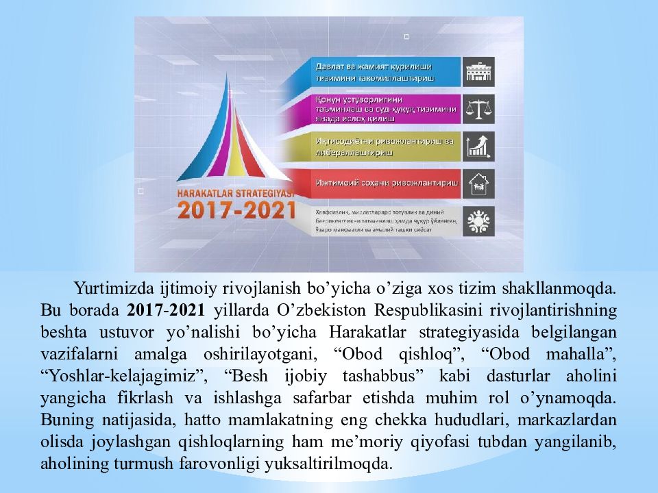 Yurtimizda ijtimoiy rivojlanish bo’yicha o’ziga xos tizim shakllanmoqda. Bu borada 2017 - 2021 yillarda O’zbekiston Respublikasini rivojlantirishning beshta ustuvor yo’nalishi bo’yicha Harakatlar strategiyasida belgilangan vazifalarni amalga oshirilayotgani, “ Obod qishloq ”, “ Obod mahalla ”, “ Yoshlar-kelajagimiz ”, “ Besh ijobiy tashabbus ” kabi dasturlar aholini yangicha fikrlash va ishlashga safarbar etishda muhim rol o’ynamoqda. Buning natijasida, hatto mamlakatning eng chekka hududlari, markazlardan olisda joylashgan qishloqlarning ham me’moriy qiyofasi tubdan yangilanib, aholining turmush farovonligi yuksaltirilmoqda.