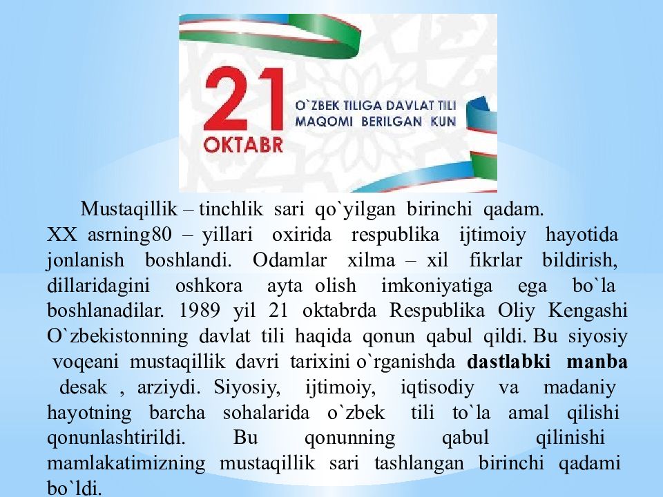 Musta q illik – tinchlik sari qo ` yilgan birinchi q adam. XX asrning 80 – yillari oxirida respublika ijtimoiy h ayotida jonlanish boshlandi. Odamlar xilma – xil fikrlar bildirish, dillaridagini oshkora ayta olish imkoniyatiga ega b o` la boshlanadilar. 1989 yil 21 oktabrda Respublika Oliy Kengashi O` zbekistonning davlat tili h a q ida q onun q abul q ildi. Bu siyosiy vo q eani musta q illik davri tarixini o` rganishda dastlabki manba desak, arziydi. Siyosiy, ijtimoiy, i q tisodiy va madaniy h ayotning barcha so h alarida o` zbek tili t o` la amal q ilishi q onunlashtirildi. Bu q onunning q abul q ilinishi mamlakatimizning musta q illik sari tashlangan birinchi q adami b o` ldi.