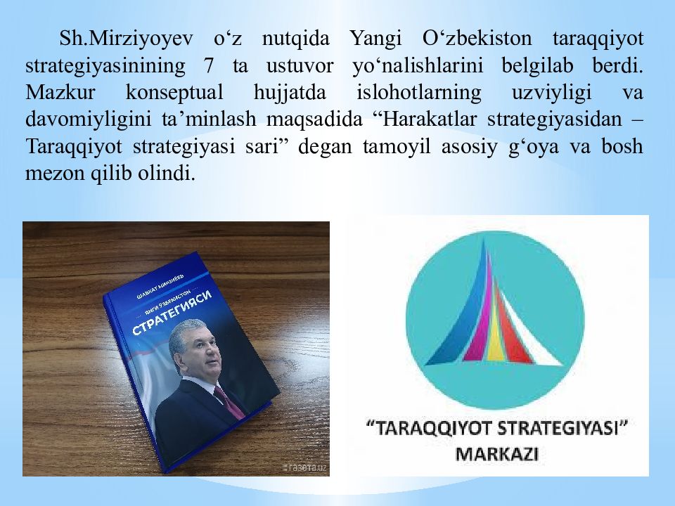 Sh.Mirziyoyev o‘z nutqida Yangi O‘zbekiston taraqqiyot strategiyasinining 7 ta ustuvor yo‘nalishlarini belgilab berdi. Mazkur konseptual hujjatda islohotlarning uzviyligi va davomiyligini ta’minlash maqsadida “ Harakatlar strategiyasidan – Taraqqiyot strategiyasi sari” degan tamoyil asosiy g‘oya va bosh mezon qilib olindi.