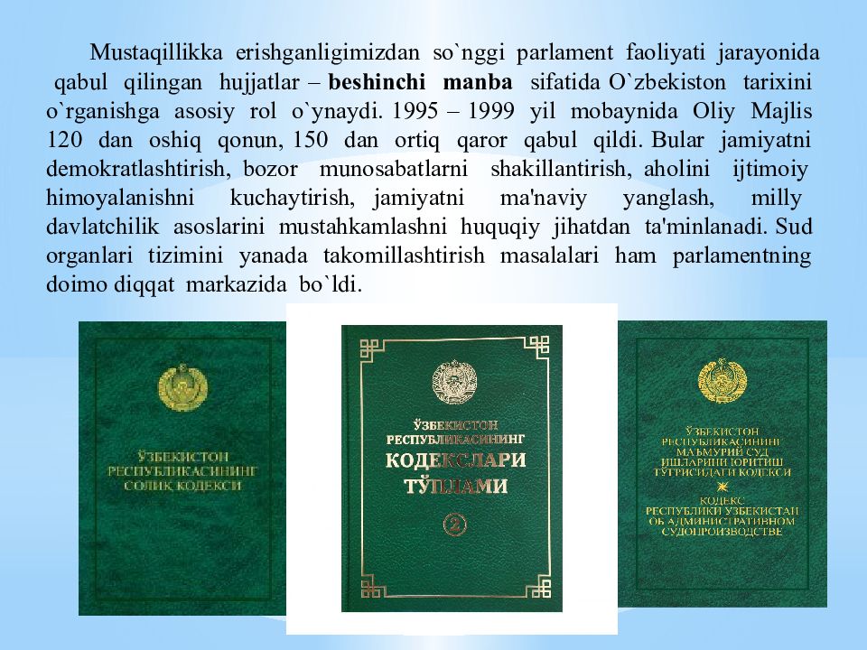 Musta q illikka erishganligimizdan s o` nggi parlament faoliyati jarayonida q abul q ilingan h ujjatlar – beshinchi manba sifatida O` zbekiston tarixini o` rganishga asosiy rol o` ynaydi. 1995 – 1999 yil mobaynida Oliy Majlis 120 dan oshi q q onun, 150 dan orti q q aror q abul q ildi. Bular jamiyatni demokratlashtirish, bozor munosabatlarni shakillantirish, a h olini ijtimoiy h imoyalanishni kuchaytirish, jamiyatni ma'naviy yanglash, milly davlatchilik asoslarini musta h kamlashni h u q u q iy ji h atdan ta'minlanadi. Sud organlari tizimini yanada takomillashtirish masalalari h am parlamentning doimo di qq at markazida b o` ldi.