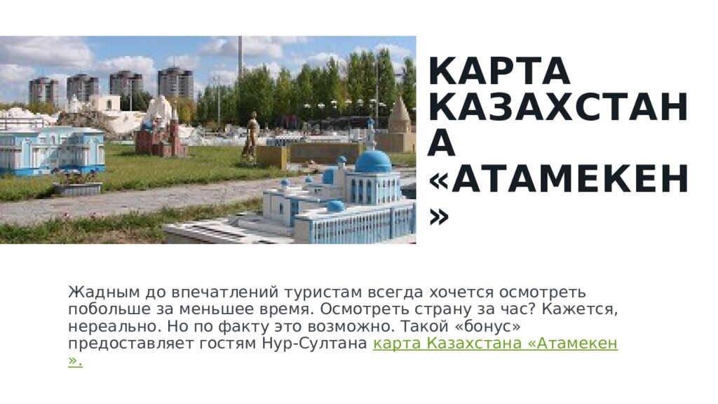 Жадным до впечатлений туристам всегда хочется осмотреть побольше за меньшее время. Осмотреть страну за час? Кажется, нереально. Но по факту это возможно. Такой «бонус» предоставляет гостям Нур-Султана карта Казахстана « Атамекен ».