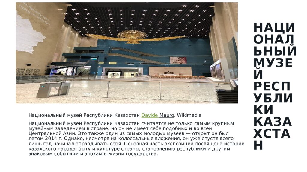 Национальный музей Республики Казахстан Davide Mauro, Wikimedia Национальный музей Республики Казахстан считается не только самым крупным музейным заведением в стране, но он не имеет себе подобных и во всей Центральной Азии. Это также один из самых молодых музеев — открыт он был летом 2014 г. Однако, несмотря на колоссальные вложения, он уже спустя всего лишь год начинал оправдывать себя. Основная часть экспозиции посвящена истории казахского народа, быту и культуре страны, становлению республики и другим знаковым событиям и эпохам в жизни государства.