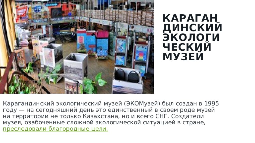 Карагандинский экологический музей (ЭКОМузей) был создан в 1995 году — на сегодняшний день это единственный в своем роде музей на территории не только Казахстана, но и всего СНГ. Создатели музея, озабоченные сложной экологической ситуацией в стране, преследовали благородные цели.