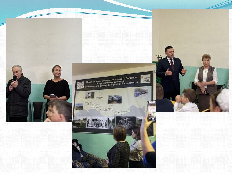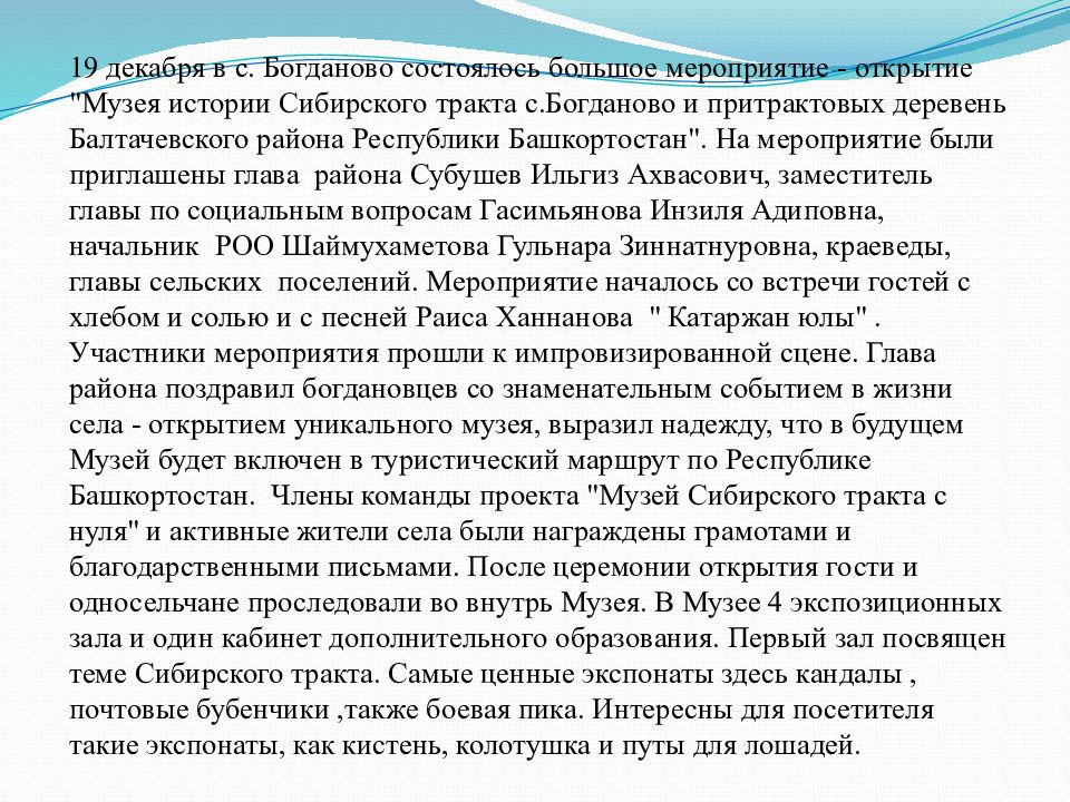 19 декабря в с. Богданово состоялось большое мероприятие - открытие "Музея истории Сибирского тракта с.Богданово и притрактовых деревень Балтачевского района Республики Башкортостан". На мероприятие были приглашены глава района Субушев Ильгиз Ахвасович, заместитель главы по социальным вопросам Гасимьянова Инзиля Адиповна, начальник РОО Шаймухаметова Гульнара Зиннатнуровна, краеведы, главы сельских поселений. Мероприятие началось со встречи гостей с хлебом и солью и с песней Раиса Ханнанова " Катаржан юлы". Участники мероприятия прошли к импровизированной сцене. Глава района поздравил богдановцев со знаменательным событием в жизни села - открытием уникального музея, выразил надежду, что в будущем Музей будет включен в туристический маршрут по Республике Башкортостан. Члены команды проекта "Музей Сибирского тракта с нуля" и активные жители села были награждены грамотами и благодарственными письмами. После церемонии открытия гости и односельчане проследовали во внутрь Музея. В Музее 4 экспозиционных зала и один кабинет дополнительного образования. Первый зал посвящен теме Сибирского тракта. Самые ценные экспонаты здесь кандалы, почтовые бубенчики,также боевая пика. Интересны для посетителя такие экспонаты, как кистень, колотушка и путы для лошадей.