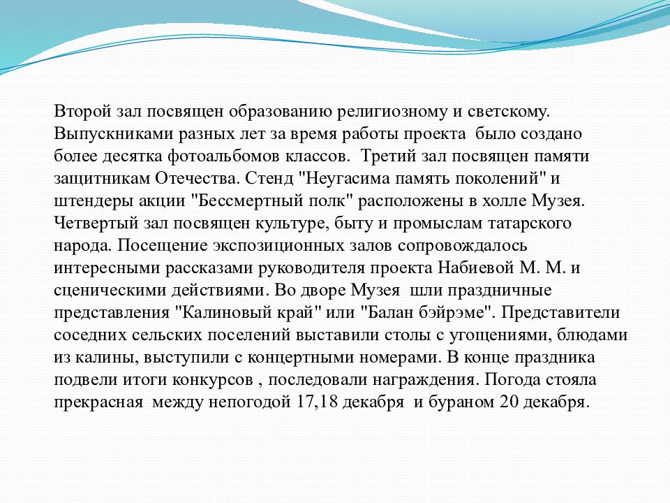 Второй зал посвящен образованию религиозному и светскому. Выпускниками разных лет за время работы проекта было создано более десятка фотоальбомов классов. Третий зал посвящен памяти защитникам Отечества. Стенд "Неугасима память поколений" и штендеры акции "Бессмертный полк" расположены в холле Музея. Четвертый зал посвящен культуре, быту и промыслам татарского народа. Посещение экспозиционных залов сопровождалось интересными рассказами руководителя проекта Набиевой М. М. и сценическими действиями. Во дворе Музея шли праздничные представления "Калиновый край" или "Балан бэйрэме ". Представители соседних сельских поселений выставили столы с угощениями, блюдами из калины, выступили с концертными номерами. В конце праздника подвели итоги конкурсов, последовали награждения. Погода стояла прекрасная между непогодой 17,18 декабря и бураном 20 декабря.