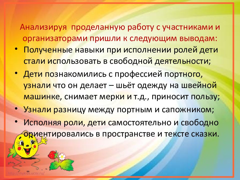 Полученные навыки при исполнении ролей дети стали использовать в свободной деятельности; Дети познакомились с профессией портного, узнали что он делает – шьёт одежду на швейной машинке, снимает мерки и т.д., приносит пользу; Узнали разницу между портным и сапожником; Исполняя роли, дети самостоятельно и свободно ориентировались в пространстве и тексте сказки.