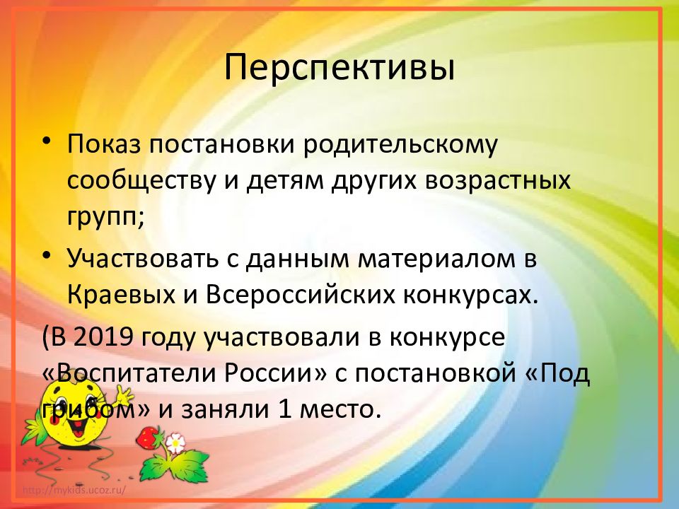 Показ постановки родительскому сообществу и детям других возрастных групп; Участвовать с данным материалом в Краевых и Всероссийских конкурсах. (В 2019 году участвовали в конкурсе «Воспитатели России» с постановкой «Под грибом» и заняли 1 место.