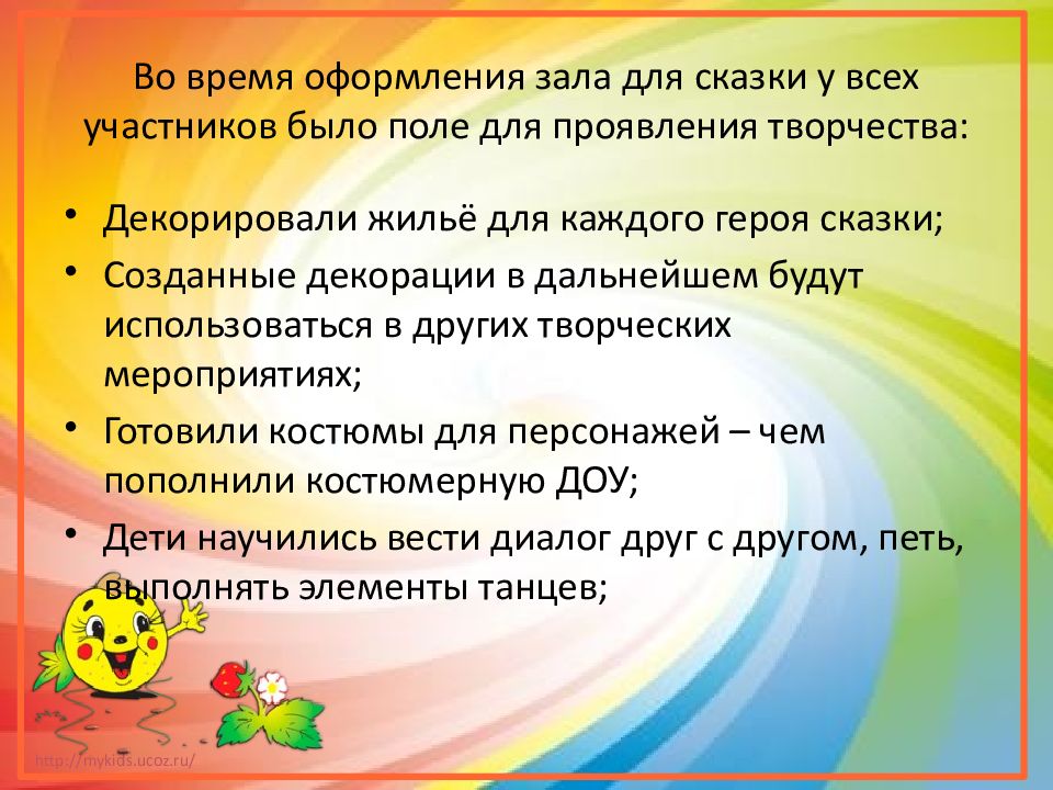 Декорировали жильё для каждого героя сказки; Созданные декорации в дальнейшем будут использоваться в других творческих мероприятиях; Готовили костюмы для персонажей – чем пополнили костюмерную ДОУ; Дети научились вести диалог друг с другом, петь, выполнять элементы танцев;